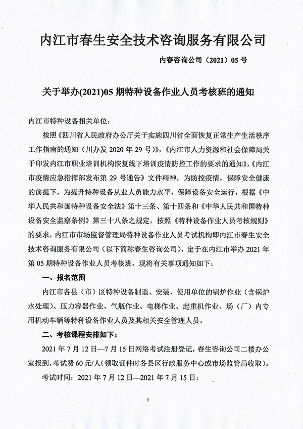2021年春生公司05期特種設(shè)備作業(yè)人員考核班通知
