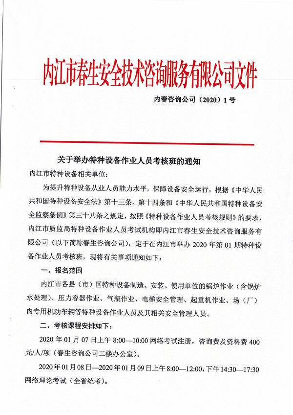 2020年第一期特種設備作業(yè)人員考核培訓班的通知